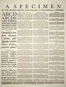 A Specimen of of typeset fonts and languages, by William Caslon, letter founder; from the 1728 Cyclopaedia.