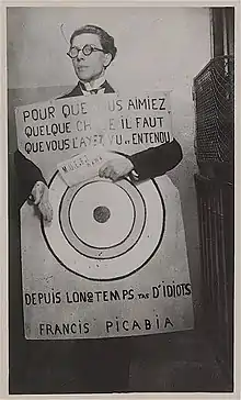photo, 1920, of André Breton at the Dada festival in Paris; bearing a sign designed by Surrealist Francis Picabia