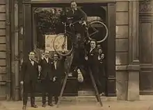 photo, May 1921, of the Opening of the Max Ernst exhibition at the gallery Au Sans Pareil; Philippe Soupault on top of the ladder with a bicycle under his arm, Jacques Rigaut (upside down), André Breton and Simone Kahn