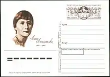 Anna Andreevna Gorenko [А́нна Андре́евна Горе́нко] (23 June {11 June O.S.} 1889 - 5 March 1966) was a Russian poet, known primarily by her pen name Anna Akhmatova [А́нна Ахма́това]. Her work was condemned and censored by Soviet authorities and she notably chose not to emigrate, but remained in Russia, acting as witness to the difficulties of living and writing in the shadow of Stalinism.