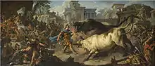 - And now, from somewhere in the bowels of the earth, from the smoky stronghold where they slept, the pair of bulls appeared, breathing flames of fire. The Argonauts were terrified at the sight. But Jason planting his feet apart stood to receive them... He held his shield in front of him, and the two bulls, bellowing loudly, charged and butted it with their strong horns...
