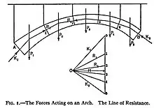 - The action and reaction between adjacent voussoirs occur along the lines of the forces R, therefore the polygon composed of these forces is appropriately named the Line of Resistance. It may be obtained as the funicular polygon of the forces P with the end-reactions K as the terminal sides.