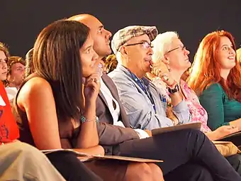An audience is a group of people who participate in a show or encounter a work of art, literature (in which they are called "readers"), theatre, music (in which they are called "listeners"), video games (in which they are called "players"), or academics in any medium.
