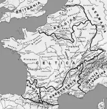 Map with the approximate location of pre-Roman Belgic Gaul shortly before Roman conquest, according to an interpretation of Caesar