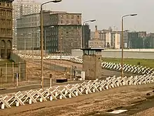 The Berlin Wall (German: Berliner Mauer) was a guarded concrete barrier that physically and ideologically divided Berlin from 1961 to 1989. The barrier included guard towers placed along large concrete walls, accompanied by a wide area (later known as the "death strip") that contained anti-vehicle trenches, beds of nails and other defenses. The Eastern Bloc portrayed the Wall as protecting its population from fascist elements conspiring to prevent the "will of the people" from building a socialist state in East Germany.