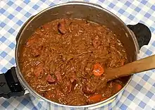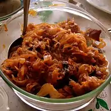 Bigos is a Polish dish of cabbage and sauerkraut stewed with assorted finely chopped meats.