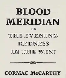 Blood Meridian or The Evening Redness in the West is a 1985 epic novel by American author Cormac McCarthy, classified under the Western, or sometimes the anti-Western, genre. In a loosely historical context the narrative follows a fictional teenager referred to as "the kid," with the bulk of the text devoted to his experiences with the Glanton gang, a historical group of scalp hunters who massacred aboriginal Americans and others in the borderlands from 1849 to 1850 for bounty, pleasure, and eventually out of nihilistic habit. The role of antagonist is gradually filled by Judge Holden, a physically massive, highly educated, preternaturally skilled member of the gang who is extremely pale and completely bald from head to toe. Although the novel initially received lukewarm critical and commercial reception, it has since become highly acclaimed and is widely recognized as McCarthy's magnum opus and one of the greatest American novels of all time.