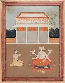 - Brahma is usually depicted as having four faces, symbolic of a wide-ranging four-square capacity, as expressed in the four Vedas (collections of poems and hymns), the four yugas (“ages”), the four varnas (social classes), the four directions, the four stages of orthodox life, or life according to correct practice (ashramas), and so forth. He is usually shown with four arms, holding an alms bowl, a bow, prayer beads, and a book. He may be seated or standing on a lotus throne or on his mount, a goose. Savitri and Sarasvati, respectively exemplars of faithfulness and of music and learning, frequently accompany him.