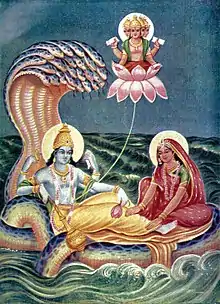 - After dissolution of the Universe, Brahma, drifting in the primordial waters that preceded creation, came across Ganesha sitting in a lone banyan tree that remained. Ganesha touched Brahma's head and initiated him into the mantra 'Om'. Brahma prayed before Ganesha who bestowed upon him the knowledge to create the universe, in return for which he gave Ganesha his two wives, representative of prudence and prosperity.