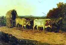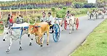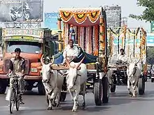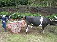 A bullock cart or ox cart is a two-wheeled or four-wheeled vehicle pulled by oxen (draught cattle). It is a means of transportation used since ancient times in many parts of the world. They are still used today where modern vehicles are too expensive or the infrastructure does not favor them.