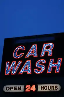 A car wash (also written as "carwash") or auto wash is a facility used to clean the exterior and, in some cases, the interior of motor vehicles. Car washes can be self-serve, fully automated, or full-service with attendants who wash the vehicle.
