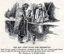Czerny introduces his pupil Franz Liszt to Beethoven. Drawing by Rudolf Lipus.