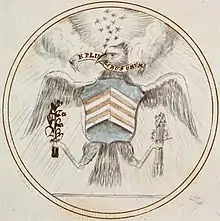 - On a field, _____ Chevrons composed of seven pieces on one side & six on the other, joined together at the top in such wise that each of the six bears against or is supported by & supports two of the opposite side the pieces of the chevrons on each side alternate red & white. The shield borne on the breast of an American Eagle on the wing & rising proper. In the dexter talon of the Eagle an Olive branch & in the sinister a bundle of Arrows. Over the head of the Eagle a Constellation of Stars surrounded with bright rays and at a little distance clouds. In the bill of the Eagle a scroll with these words E pluribus unum.