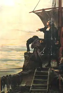 - At two o'clock in the morning the land was discovered, at two leagues' distance; they took in sail and remained under the square-sail lying to till day, which was Friday, when they found themselves near a small island, one of the Lucayos, called in the Indian language Guanahani. Presently they descried people, naked, and the Admiral landed in the boat, which was armed, along with Martin Alonzo Pinzon, and Vincent Yanez his brother, captain of the Nina. The Admiral bore the royal standard, and the two captains each a banner of the Green Cross, which all the ships had carried; this contained the initials of the names of the King and Queen each side of the cross, and a crown over each letter Arrived on shore, they saw trees very green many streams of water, and diverse sorts of fruits.