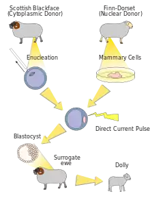 - Reproductive cloning is a technology used to generate an animal that has the same nuclear DNA as another currently or previously existing animal. Dolly was created by reproductive cloning technology. In a process called "somatic cell nuclear transfer" (SCNT), scientists transfer genetic material from the nucleus of a donor adult cell to an egg whose nucleus, and thus its genetic material, has been removed. The reconstructed egg containing the DNA from a donor cell must be treated with chemicals or electric current in order to stimulate cell division. Once the cloned embryo reaches a suitable stage, it is transferred to the uterus of a female host where it continues to develop until birth.
