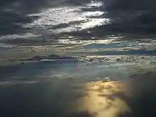 Clouds are visible masses of water droplets or frozen ice crystals suspended in the atmosphere above the surface of the Earth or another planetary body. When the water in clouds becomes sufficiently condensed, it falls as rain.