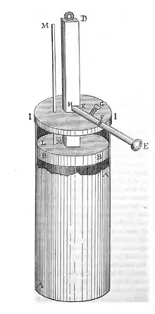 - AA is a tube of uniform diameter throughout, close shut at the bottom; BB is a piston fitted to the tube; DD a handle fixed to the piston; EE an iron rod moveable round an axis in F; G a spring, pressing the cross rod EE, so that the said rod must be forced into the groove H as soon as the piston with the handle has arrived at such a height as that the said groove H appears above the lid II; L is a little hole in the piston, through which the air can escape from the bottom of the tube AA, when first the piston is forced into it. The use of this instrument is as follows: A small quantity of water is poured into the tube AA; to the depth of 3 or 4 lines; then the piston is inserted, and forced down to the bottom, till a portion of the water previously poured in comes through the hole L; then the said hole is closed by the rod MM. Next the lid II, pierced with the apertures requisite for that purpose, is put on, and a moderate fire being applied, the tube AA soon grows warm, (being made of thin metal), and the water within it, being turned into steam, exerts a pressure so powerful as to overcome the weight of the atmosphere and force up the piston BB, till the groove H of the handle DD appears above the lid II, and the rod EE is forced, with some noise, into the said groove by the spring G. Then forthwith the fire is to be removed, and the steam in the thin metal tube is soon resolved into water, and leaves the tube entirely void of air. Next, the rod EE being turned round so far as to come out of the groove H, and allow the handle DD to descend, the piston BB is forthwith pressed down by the whole weight of the atmosphere, and causes the intended movement, which is of an energy great in proportion to the size of the tube. Nor is it to be doubted that the whole weight of the atmosphere exerts its force in tubes so constructed; for I have established by experiment, that a piston, raised to the top of the tube by the force of heat, shortly afterwards descends again to the bottom, and so on alternately for a number of times, so that no suspicion can arise of air pressing beneath. Now my tube, the diameter of which does not exceed 2 ½ inches, yet raises sixty lbs. aloft with the same velocity as the piston is forced down into the tube, and the tube itself scarcely weighs five ounces. I therefore have little doubt but that tubes may be manufactured, the weight of each of which would scarcely amount to 40 lbs., and yet which could raise, at each operation, two thousand lbs. to a height of four feet. ...If any one now will consider the magnitude of the forces to be obtained in this way, and the trifling expense at which a sufficient quantity of fuel can be procured, he will certainly admit that this my method is far preferable to the use of gunpowder above spoken of, especially as in this way a perfect vacuum is obtained, and so the inconveniences above recounted are avoided.