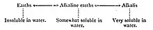 - Earths thus came to be included in the term "alkali," when that term was used in its widest acceptation. But a little later it was found that some of the earths were thrown down in the solid form from their solutions in acids by the addition of alkalis; this led to a threefold division... The distinction at first drawn between "earth" and "alkali" was too absolute; the intermediate group of "alkaline earths" served to bridge over the gap between the extreme groups.