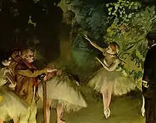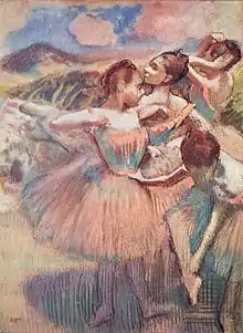 - Whenever Degas came upon some more or less early work of his own, he always wanted to get it back on the easel and rework it. Thus, after seeing again and again at our house [of the art-buyer w:Henri Rouart ] a delightful pastel my father had bought and was very fond of, Degas.. ..would not let the matter alone, and in the end my father, from sheer weariness, let him take it away. It was never seen again.. ..in the end he had to confess his crime: the work entrusted to him for a few retouches had been completely destroyed.. ..It was then that Degas, to make it up to him for his loss, sent him one day the famous 'Danseuses a la barre'..