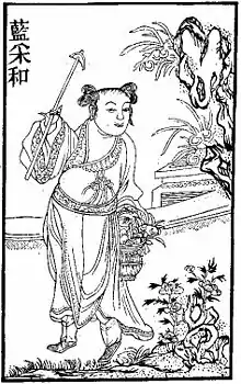 Ancient woodcut of Lain Caihe, one of the Eight Immortals of Chinese mythology. His sex and age are unknown. He is usually portrayed as an effeminate boy or as a hermaphrodite.