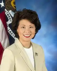 Elaine Lan Chao (March 26, 1953–) is an American businesswoman and politician. A member of the Republican Party, Chao served as Secretary of Transportation in the Trump administration from 2017 to 2021, and as Secretary of Labor in the Bush administration from 2001 to 2009.