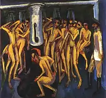 Kirchner, 1915: 'Das Soldatenbad / The soldier bath', oil-painting on canvas; current location: Solomon R. Guggenheim Museum N.Y.C. - quote of Kirchner, after being discharged from the army because of a mental crisis, 1916: 'The heaviest burden of all is the presence of the war and the increasing superficiality. It gives me incessantly the impression of a bloody carnival..'