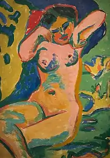 - ..he [is Kirchner, writing about himself] was especially interested in the naturally naked human being. He knowingly broke the traditional manner of the nude study and created for himself in his studio [in his Brücke-years in Berlin] a circle of young women, whom he studied in their free movement. Thousands of drawings and hundreds of paintings and studies resulted from this. A beautiful, healthy, blossoming sensuality that never turns base emanates from these works.