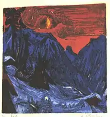Kirchner, 1919: 'Winter-moon night / Wintermondnacht', color-woodcut; location, unknown - quote of Kirchner about winter-moonlight, Jan. 1919: 'There was such a wonderful setting of the moon this morning, the yellow moon against little pink clouds, and the mountains a pure deep blue, quite glorious, I would so have liked to paint. But it was cold, even my window was frozen.. ' (some time later he made this wood-cut