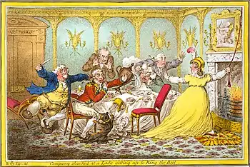 In Company Shocked at a Lady Getting up to Ring the Bell (1805) James Gillray caricatured "A widow and her suitors, who seem to have forgot their manners in the intensity of their admiration."[1]