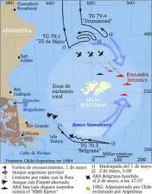 The deployment of Ar+Br naval forces around the Falklands Islands before the sinking of the ARA Belgrano during the Falklands War