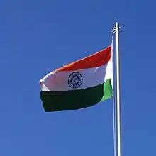 The flag of India is a horizontal rectangular tricolour of India saffron, white and India green; with the Ashoka Chakra, a 24-spoke wheel, in navy blue at its centre.