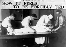 - Thursday morning, 16th July ... the three wardresses appeared again. One of them said that if I did not resist, she would send the others away and do what she had come to do as gently and as decently as possible. I consented. This was another attempt to feed me by the rectum, and was done in a cruel way, causing me great pain. She returned some time later and said she had ‘something else’ to do. I took it to be another attempt to feed me in the same way, but it proved to be a grosser and more indecent outrage, which could have been done for no other purpose than torture. It was followed by soreness, which lasted for several days.[10]