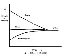 - If grand unified theories are correct, we ought to be able to derive the relative power of the strong, weak, and electromagnetic interactions at accessible energies from their presumed equality at much higher energies. When this is attempted, a wonderful result emerges. ...in the form first calculated by Howard Georgi, Helen Quinn, and Steven Weinberg ...The couplings of strong-interaction gluons decrease, those of the [weak interaction] W bosons stay roughly constant, and those of the [electromagnetic interaction] photons increase at short distances [or high energies]—so they all tend to converge, as desired.