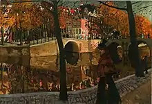 Breitner, 1897-98: 'Singelbrug bij de Paleisstraat te Amsterdam', oil on canvas; - info of the Rijksmuseum: initially Breitner painted a housemaid in front of the painting, in the middle; but after a negative criticism, the art-dealer who sold his paintings thought it would be better to make a lady of her. So Breitner did, in this case