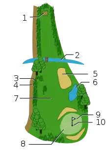 Golf, unlike most ball games, cannot and does not utilize a standardized playing area, and coping with the varied terrains encountered on different courses is a key part of the game. The game at the usual level is played on a course with an arranged progression of 18 holes, though recreational courses can be smaller, often having nine holes. Each hole on the course must contain a tee box to start from, and a putting green containing the actual hole or cup 4 1⁄4 inches (11 cm) in diameter. There are other standard forms of terrain in between, such as the fairway, rough (long grass), bunkers (or "sand traps"), and various hazards (water, rocks) but each hole on a course is unique in its specific layout and arrangement.