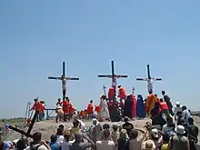 *In many places, Christians of different denominations join for a procession [on Good Friday] through a city or town. The procession passes through the streets, usually with one or two people carrying a large wooden cross]], which may be placed in a square or other area large enough to allow a short act of worship to take place.