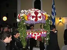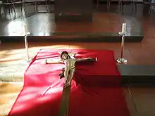 *Enough hosts should be consecrated to allow for the Communion of the faithful on Good Friday. The altar of repose for the Blessed Sacrament should be carefully constructed, but need not be overly ornate. **Robert C. Rabe, et. Al, in Sourcebook for Sundays, Seasons, and Weekdays 2014: The Almanac for Pastoral..., p. 147 *The rubrics call for the altar to be stripped and the removal or veiling of crosses after the liturgy in preparation for Good Friday. Veils should be violet in color. If the font is to be emptied, this may happen at this time also. While the church need not be stripped of furniture and art, generally simplicity should be the norm for Good Friday. Because people remain to pray before the Blessed Sacrament, any work on the environment should be done in silence, particularly if the place of repose is within earshot....The Blessed Sacrament is brought into the sanctuary for Holy Communion along with a fair linen, corporal and candles. These are returned to the altar of repose and the sacristy, respectively after Communion. **Robert C. Rabe, et. Al, in "Sourcebook for Sundays, Seasons, and Weekdays 2014: The Almanac for Pastoral...", p. 147 Epitaphios