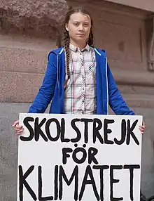 Greta Thunberg (born 3 January 2003) is a Swedish climate activist. In August 2018, she initiated the School strike for climate movement and in early-December the same year she spoke at the United Nations Climate Change conference to denounce world leaders for their inaction.