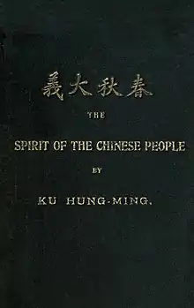 Gu Hongming, in his time known as Ku Hung-ming (18 July 1857 – 30 April 1928) was a Chinese thinker and man of letters. Famous for his knowledge of the English language and Western civilization, he however voiced an opposition to reforms of the Chinese society.