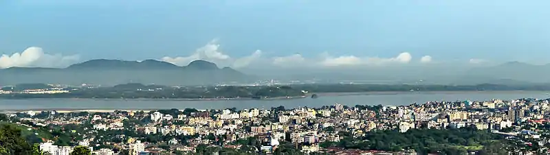 Panoramic view of Guwahati City on the banks of the Brahmaputra River.