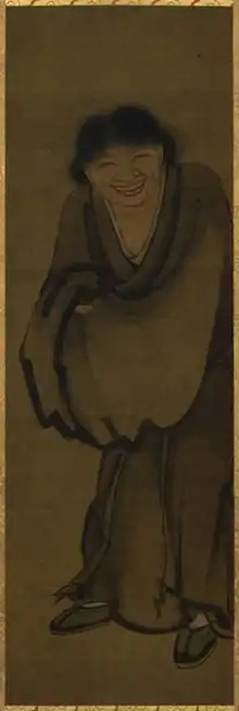 Hanshan (c.730? – c.850?) was a legendary figure associated with a collection of poems from the Chinese Tang Dynasty in the Taoist and Chan tradition. No one knows who he was, or when he lived and died. In the Buddhist tradition, Hanshan and his sidekick Shide are honored as emanations of the bodhisattvas Mañjuśrī and Samantabhadra, respectively. In Japanese and Chinese paintings, Hanshan is often depicted together with Shide or with Fenggan, another monk with legendary attributes.