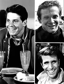 Pictured are Richie Cunningham's (Ron Howard) friends. Left: Anson Williams (Potsie Weber). Right, top: Donny Most (Ralph Malph), bottom: Henry Winkler (The Fonz, Fonzie, Arthur Fonzarelli).