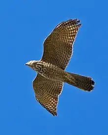 Hawks are small to medium-sized diurnal birds of prey, widely distributed and varying greatly in size. The subfamily Accipitrinae includes goshawks, sparrowhawks, the sharp-shinned hawk and others. These are mainly woodland birds with long tails and high visual acuity, hunting by sudden dashes from a concealed perch. In the Americas, members of the Buteo group are also called hawks; these are called buzzards in other parts of the world. Generally buteos have broad wings and sturdy builds. They are relatively larger winged, shorter-tailed and soar more extensively in open areas than accipiters, descending or pouncing on their prey rather than making fast horizontal pursuit. All these groups are members of the Accipitridae family, which includes the hawks and buzzards as well as kites, harriers and eagles.