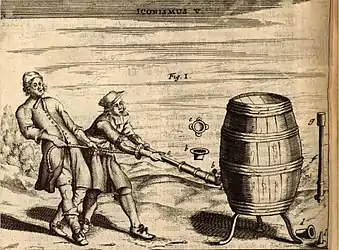 - Of fundamental importance for the study of the physical properties of gases was the invention of the air-pump by Otto von Guericke, about the middle of the seventeenth century. ...The form of the instrument underwent a gradual evolution in his hands. The earlier types were of very simple design (see Illustr. [Fig. 1]). The first consisted of a cask well caulked with pitch and filled with water, which was evacuated by means of a brass pump having two valves. As the water was pumped out, however, the air was heard rushing through the pores of the wooden cask. A similar result was obtained when the cask was completely enclosed in a larger one, also containing water. Guericke accordingly gave up using wooden vessels, and attempted instead to evacuate a copper sphere from which he pumped out the air directly without previously filling it with water. ...[T]he sphere collapsed ...owing ...to the pressure of the external air, the vessel not having been made perfectly spherical. Guericke ...had another ...constructed ...and succeeded in obtaining a fairly high vacua. This must have been before 1654...