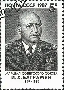 Hovhannes Khachatury Bagramyan (December 2 [O.S. November 20] 1897 – September 21, 1982), also known as Ivan Khristoforovich Bagramyan, was a Soviet Armenian military commander and Marshal of the Soviet Union. During World War II, Bagramyan was the first non-Slavic military officer to become a commander of a Front and was among several Armenians in the Soviet Army who held the highest proportion of high ranking officers in the Soviet military during the war.