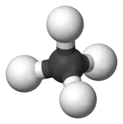 Ball-and-stick model of the methane molecule, CH4. Methane is part of a homologous series known as the alkanes, which contain single chemical bonds only.