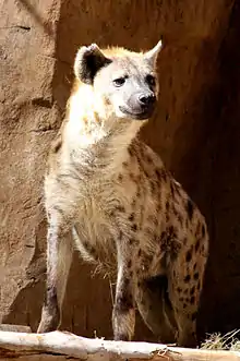 Hyenas are carnivorous mammals which, although bearing a superficial resemblance to dogs, are actually more closely related to cats and viverrids. The hyena family consists of four species ; the large, predatory spotted hyena (also known as the "laughing hyena"), the scavenging brown and striped hyena and the small, insectivorous aardwolf. With the exception of the latter species, hyenas are powefully built animals with thick necks and jaws strong enough to crush most large bones.