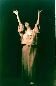 Watching her we see the soul of man moving in the dance of destiny; dreaming, hoping, aspiring, questioning; thrilling with desire and joy and melancholy, crushed, purged and raised again; the spirit of man enduring its trials and triumphing in the great adventure. This is the interpretation of life by the intuitive wisdom of genius, which is feeling confirmed by thought, and which understands that the ultimate of human apprehension is a mysticism impossible of interpretation save in symbolic art.- Shaemas O'Sheel, in "On With the Dance" in The Book of the Dance (1916), p. x.