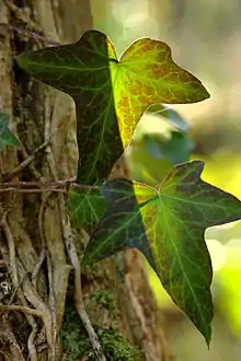 Ivy is a genus of 15 species of climbing or ground-creeping evergreen woody plants in the family Araliaceae, native to the Atlantic Islands, western, central and southern Europe, northwestern Africa and across central-southern Asia east to Japan. On suitable surfaces (trees and rock faces), they are able to climb to at least 25–30 metres above the basal ground level.