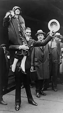 Jack Dempsey holding his wife, Estelle Taylor, on his shoulder